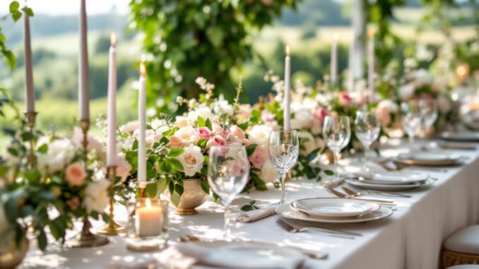Les bouquets et compositions florales représentent le cœur de ce budget. Le bouquet de la mariée coûte entre 80 et 300 euros selon les fleurs choisies et la complexité de l’arrangement. Les boutonnières pour le marié et les témoins ajoutent 15 à 30 euros par pièce. Les centres de table, élément décoratif majeur, varient de 25 à 100 euros par composition selon la taille et les fleurs utilisées.